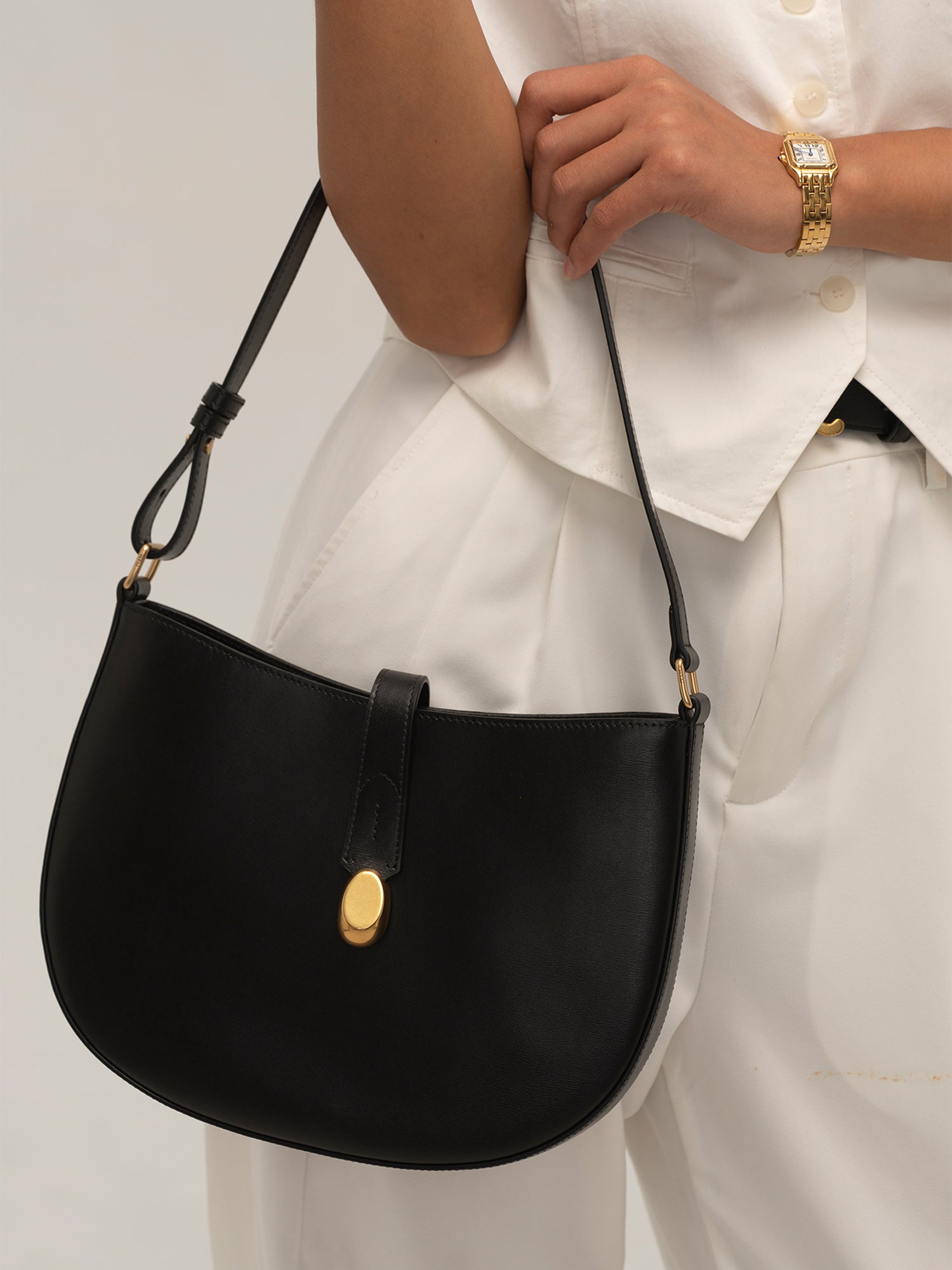 The beautiful arc shape with silky and firm leather surface shows the softness and strength of women. The slim side body and the back of the shoulder will not embarrass you with underarms, and keep the shape intact. It can accommodate a mini ipad, a choice for light work or leisure time