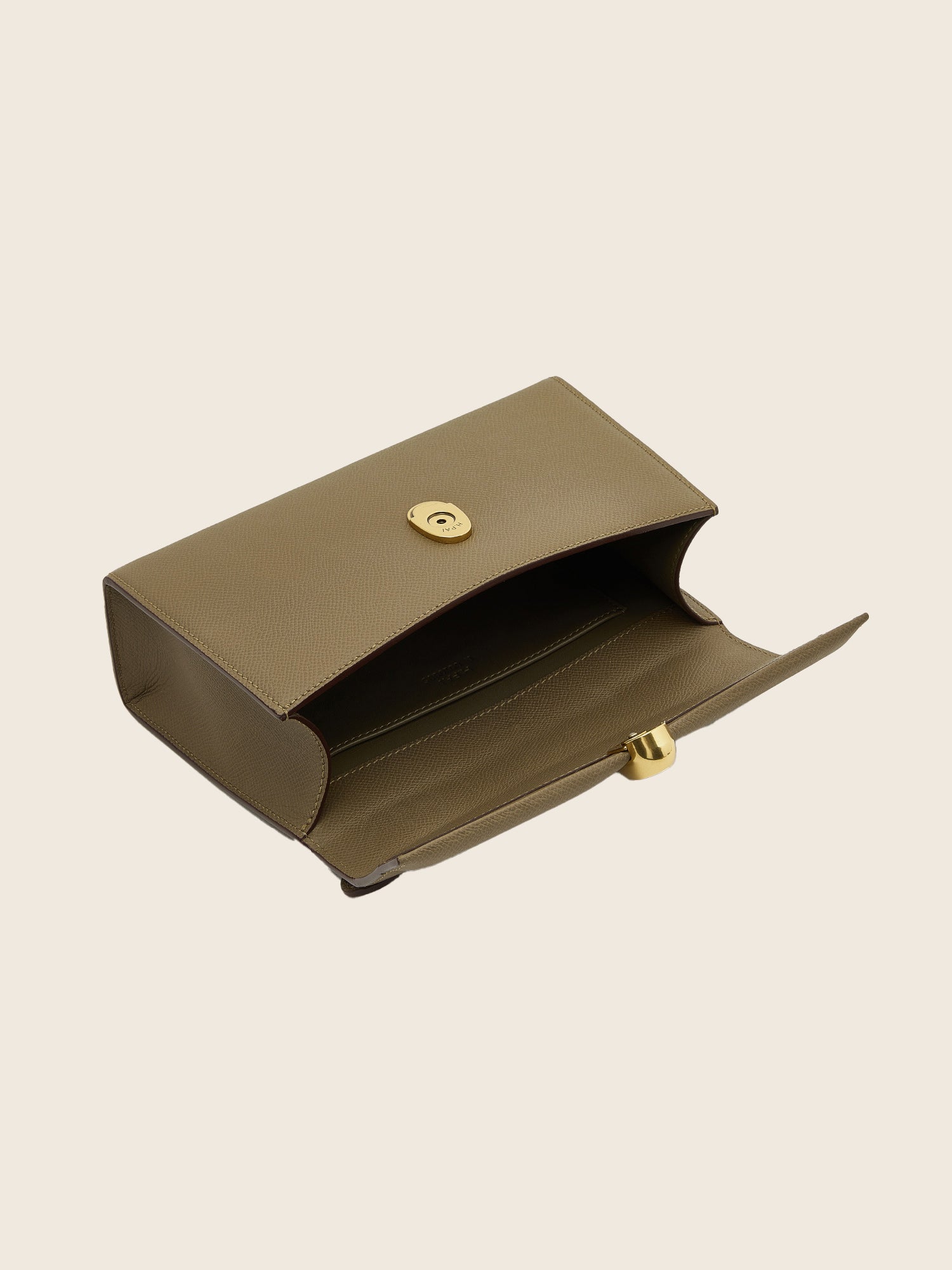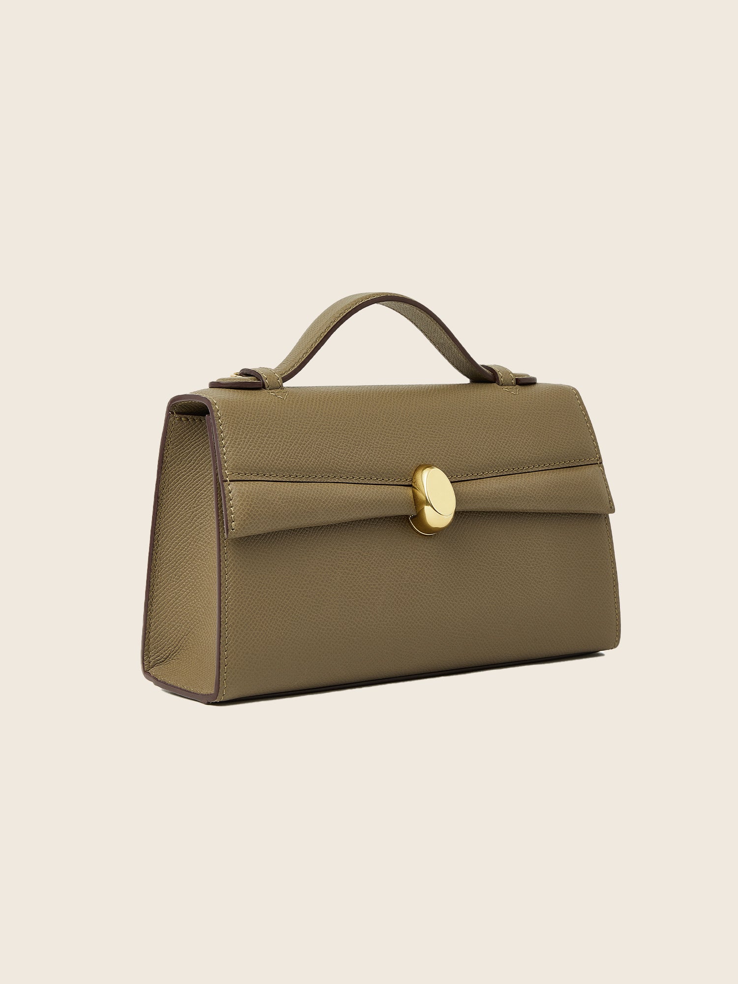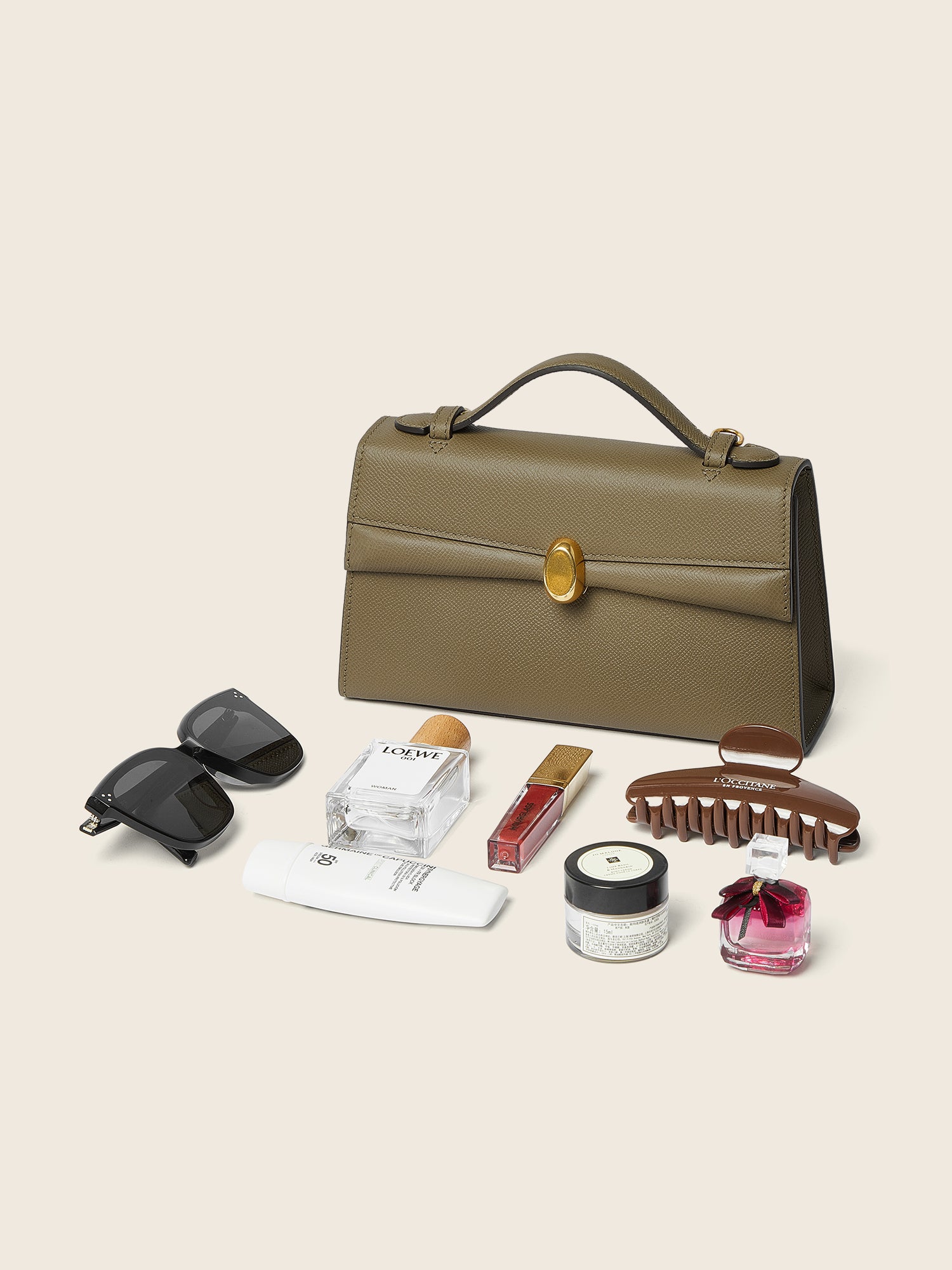 It's a great size in that it fits all my stuff (a cell phone, tissues, car keys, sunglasses & a small wallet). The shoulder strap can be tucked inside so that it can be used as a clutch. And finally, the flat base allows it to stand upright if desired. It's a great bag.